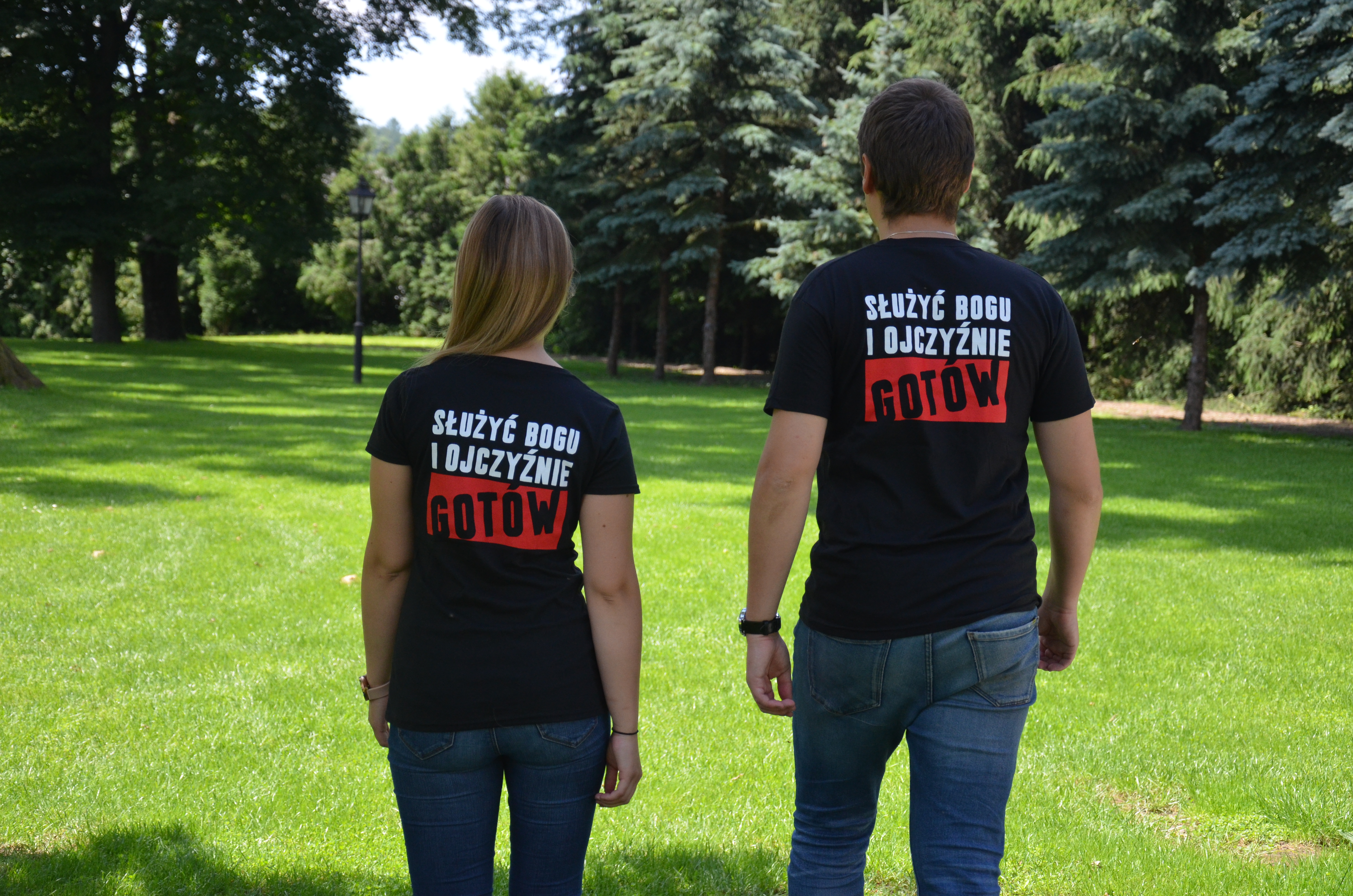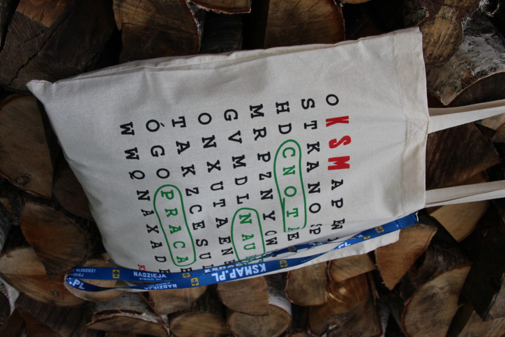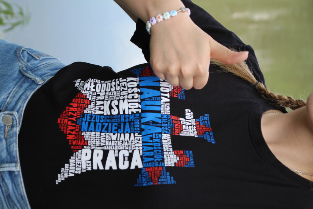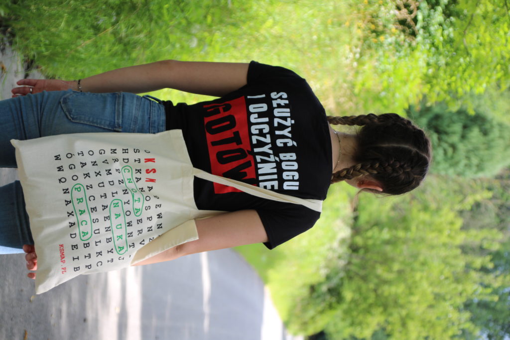 Czarna koszulka z godłem na piersi. Tył koszulki stanowi biało-czerwona flaga z zawołaniem KSM-owskim.